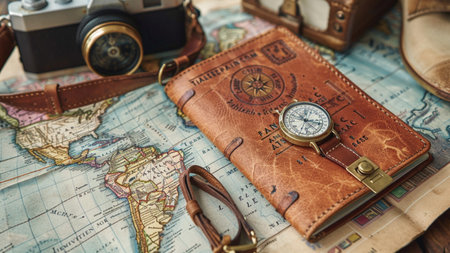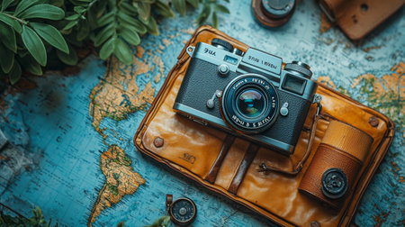 A vintage-inspired setup featuring a retro camera placed on a map, surrounded by travel-themed accessories for an adventurous vibe.