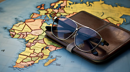Sunglasses, passport with map. Travel concept, two passports on the map of Europe
