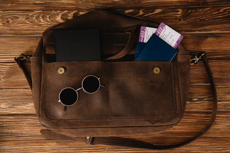 top view of leather brown bag with sunglasses and passports with tickets