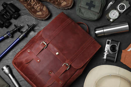 Flat lay composition with leather backpack and camping equipment for tourism on black background