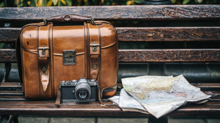 Vintage leather luggage beside retro camera and folded world map on wooden bench