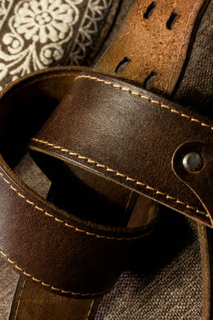 Leather men's belt on a blue fabric background. Brown vintage belt.