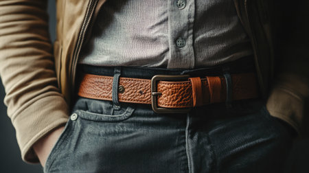 A detailed close-up of a hand adjusting a classic brown leather belt on denim jeans, highlighting the blend of style and comfort in everyday fashion choices.