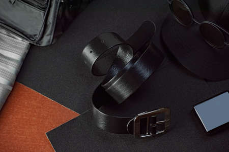 black leather belt, on a black background, with perfume next to it. including many other personal items The background is a little blurry.