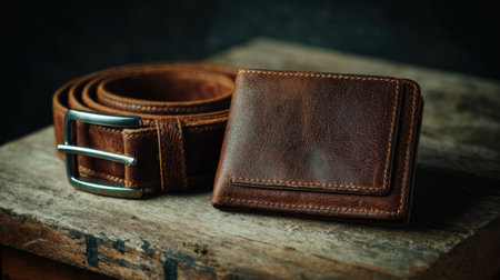 Brown leather wallet and belt placed stylishly on aged wooden table