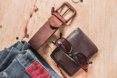 Leather and old jeans on wooden floor.