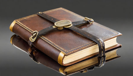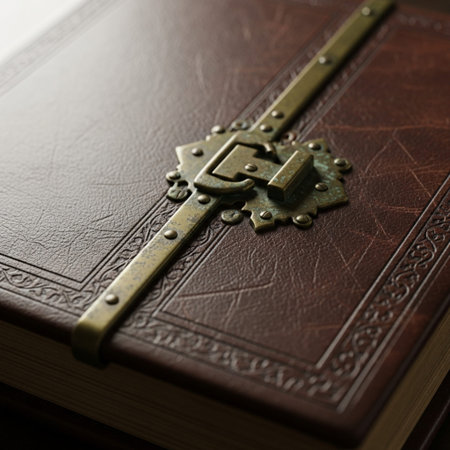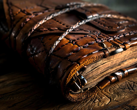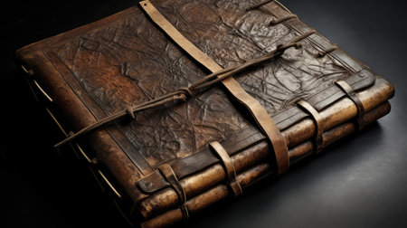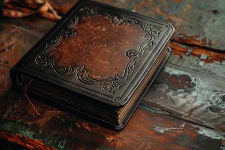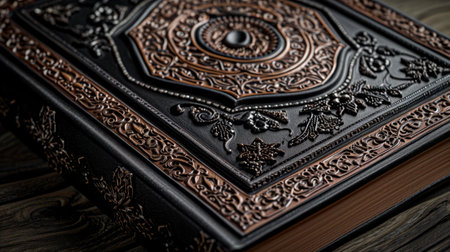 An ancient leather-bound tome, its cover intricately embossed, rests on a rustic wooden table.