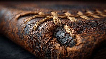 Macro shot of worn leather with visible texture and detailed stitching, highlighting the craftsmanship and durability of the material.