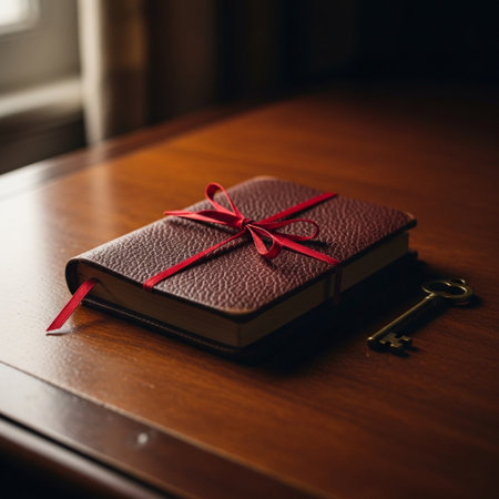 Vintage book with red ribbon and key on the wooden desk.