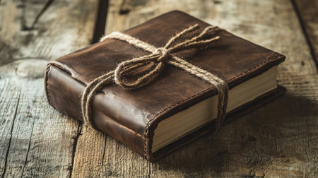 Worn leather bound book with a rustic string tie laying on a wooden table