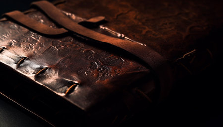 The leather cover of the album is made of brown handmade genuine leather on a black background. Elements of a leather product close-up. Craft, low contrast