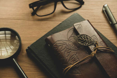 Selective focus of vintage notebook, magnifying glass,pen and glasses on wooden background.