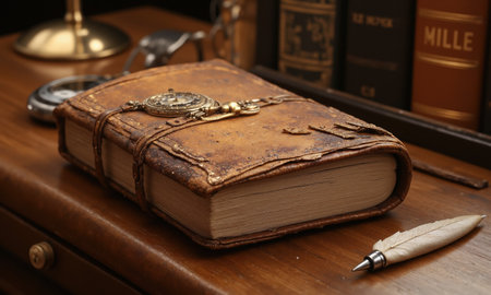 A well-worn leather-bound journal, its pages yellowed with age, resting on a wooden desk with a silver pocket watch