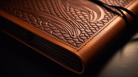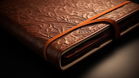 A macro shot of a luxurious leather notbook.