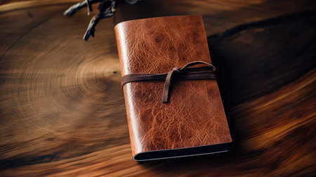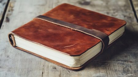 A close-up image of an elegant journal with a brown cover and textured binding, resting on a wooden surface. Perfect for inspiration or gifts.