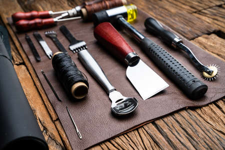 Set of Leather crafting tools. Shoes maker tools on wooden table