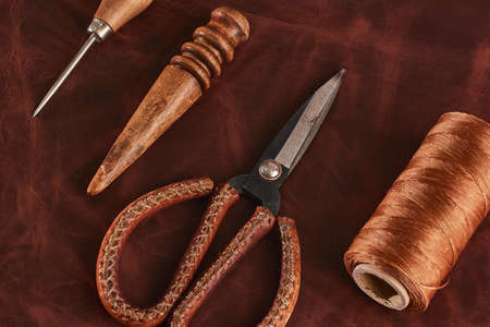 Shoemaking tools for sewing handmade shoes in workshop. Punches, awl, hammer, thread, roller on genuine leather. Workplace of shoemaker. Copy space