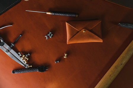 Leather craft for wallet working with tool on leather craftman's work desk .