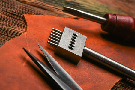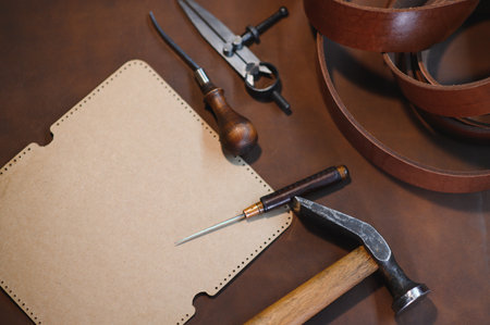 Leather craft tools on a wooden table at traditional workshop