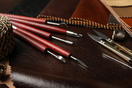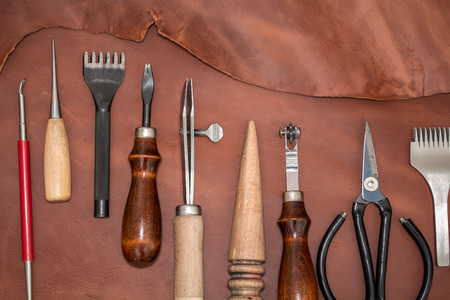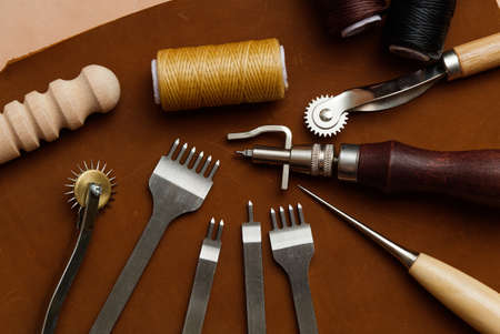 Tools for leather craft on leather backgroung.