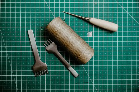 Leather craft tools on green rubber background