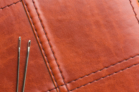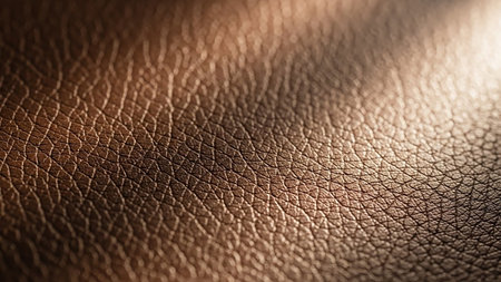 Detailed macro shot of smooth brown leather fabric with natural grains and subtle folds, showing its premium quality and warmth.