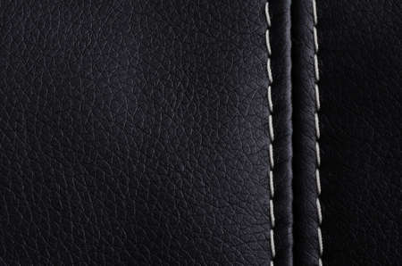 Texture of a surface from a natural skin of black color with single seam with double stitch in left side. Close-up view.
