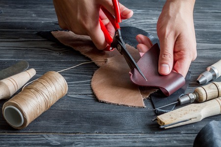 work in leather shop on dark wooden background close up
