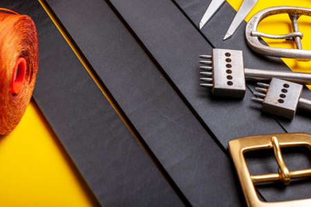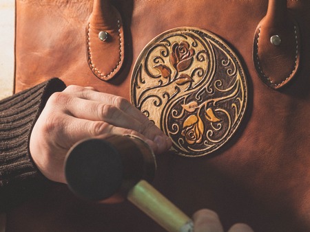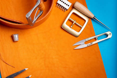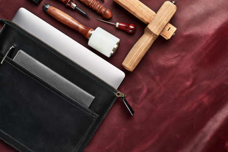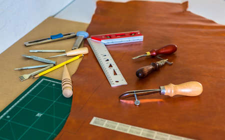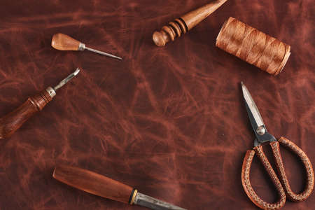 Leather craftsmanship with handmade tool object on leather working bckground