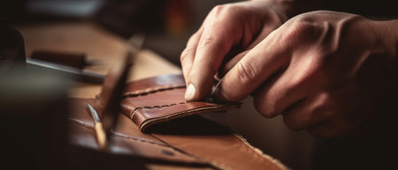 Man makes a leather wallet. Generative AI