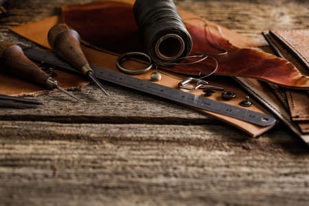 Leather craft tools on the old wood table in a shed. Leather craftsman workspace. Grounge dark wood texture background.