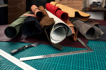 Leather crafts or leather work. pieces of dyed and leather on a craftsman's work table.