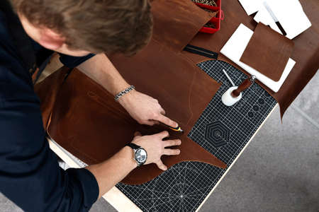 Skilled leather manufacture worker cutting some samples
