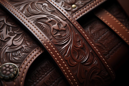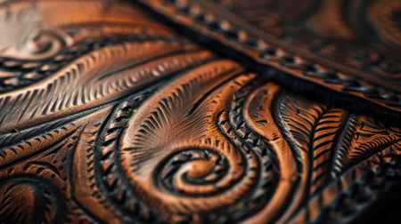 This image showcases intricately tooled leather, displaying floral and geometric patterns. The warm tones of brown and red create a visually appealing texture. The composition emphasizes depth, with an inviting tactile quality. This versatile image could be used for various commercial projects related to craftsmanship and design.