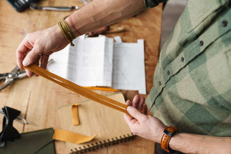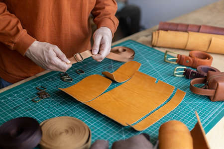 Close-up of craftsman holding pieces of leather textile in his hands and making products in workshop
