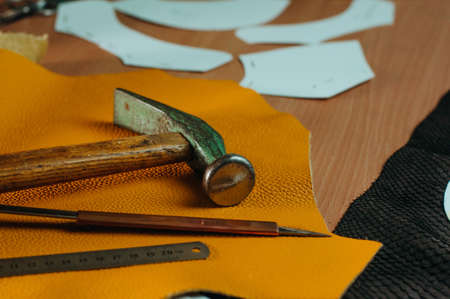 Tools of shoemaker on the table in workshop