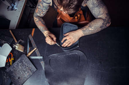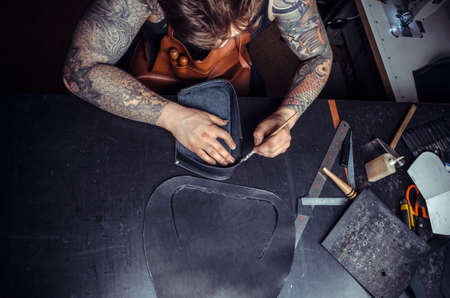 White craftsman working with leather and drawing in workshop
