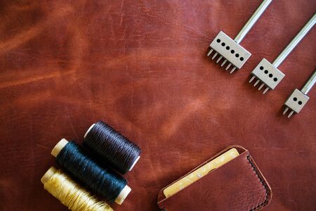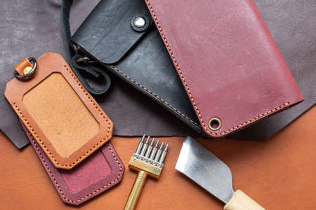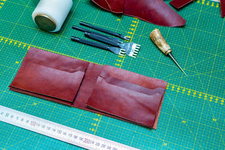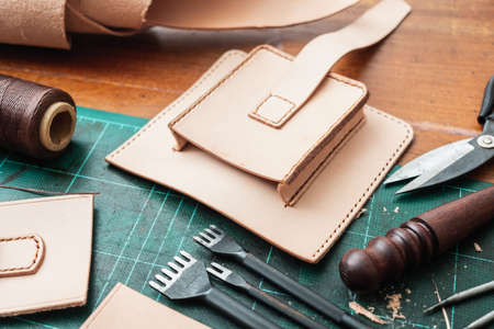 Genuine leather craft production with DIY tools used for making hand made wallet. Small business and mastership concept