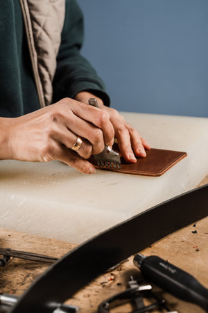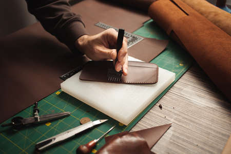 Man hands holding special instrument for making wallet from the leather. Close up. Handmade manufacturing