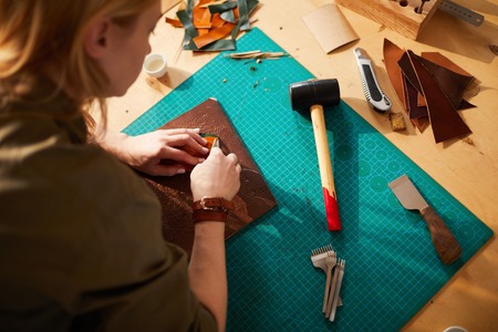 Working process of the leather product in the workshop. Closeup of craftsman working with natural leather using craft tools. Working with genuine leather. Overhead of designers work desk.