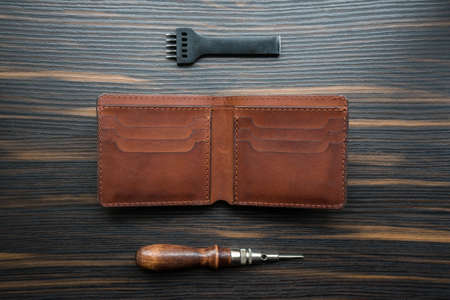 handmade brown leather wallet, punch and awl on a wooden table.