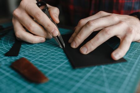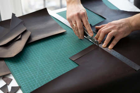 The hands of a master cut a piece of leather, a close-up of a cut of a leather product a master man for sewing leather products, craftsman for making handmade leather products