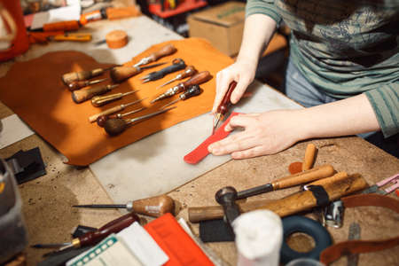 The hands of a master cut a piece of leather, a close-up of a cut of a leather product a master man for sewing leather products, craftsman for making handmade leather products