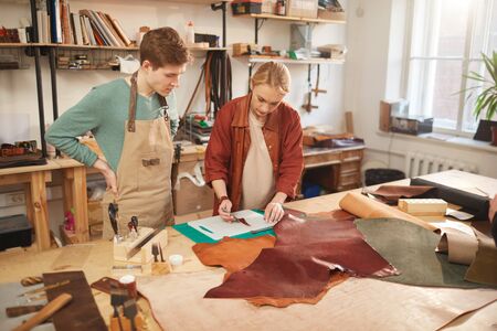 Horizontal shot of young adult female artisan working with leather detail, her colleague looking at her