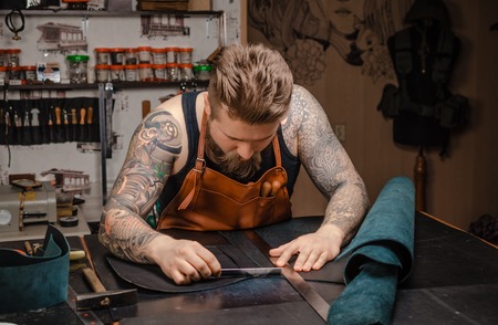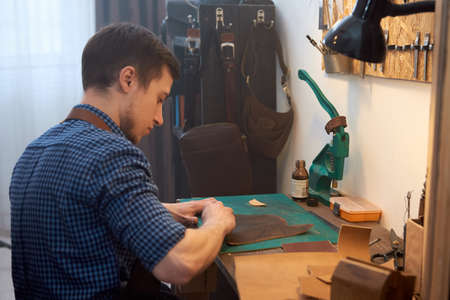 Man works in a bag making studio. Tailor in apron working with leather at workshop.