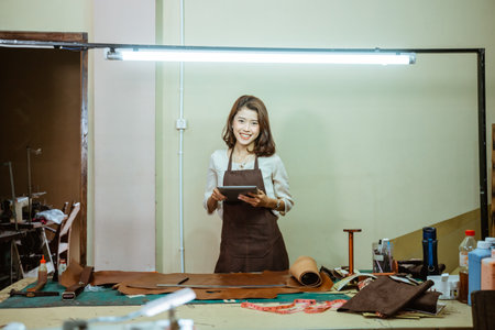 young asian craftswoman smiling at camera while using pad in leather workshop