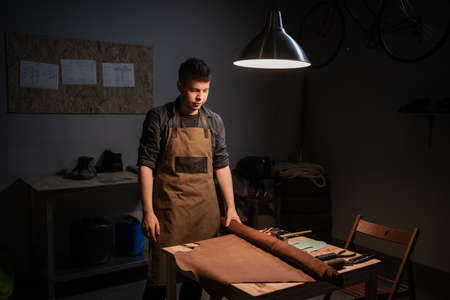 Tailor cobbler hold different rolls natural brown leather, working with textile in workshop. Concept banner Industrial professional craftsman master.