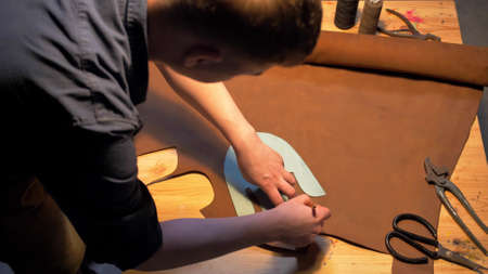 young male master working on cutting with patterns making leather goods. Hand-made leather goods manufacturing.