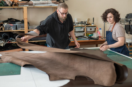 leather craftsmen working making measupenets in patterns at table in workshop studio