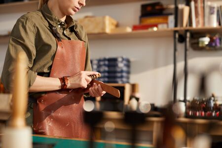 Mid section portrait of young woman working with leather while making handcrafted belt in shop lit by sunlight, copy space